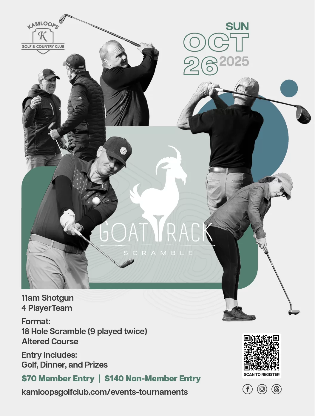 $70 Members$140 Non-Members 11am Shotgun4 Player TeamFormat: 18 Hole Scramble(9 played twice), Altered CourseEntry Includes: Golf, Dinner, and Prizes