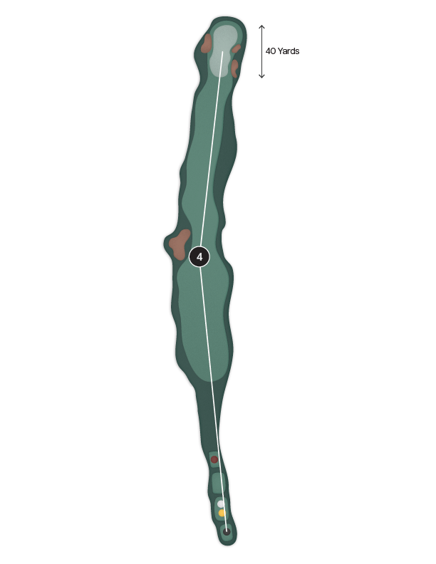 A long straight drive is needed, avoiding the bunker on the left of the landing area and OB on the right. This will set up a long iron or hybrid second shot to a deep green guarded by bunkers on each side.